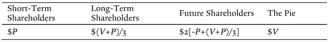 Between today and the long term, the only cash flowing between ABC and its shareholders is the payment of $V made by ABC to long-term shareholders and future shareholders when ABC’s assets are sold in the long term. Accordingly, economic value—the net amount of value flowing from ABC to ABC’s shareholders over time—is $V.95 Economic value (the pie), and the net amounts flowing to short-term shareholders and long-term shareholders, are summarized in Table 1 below.